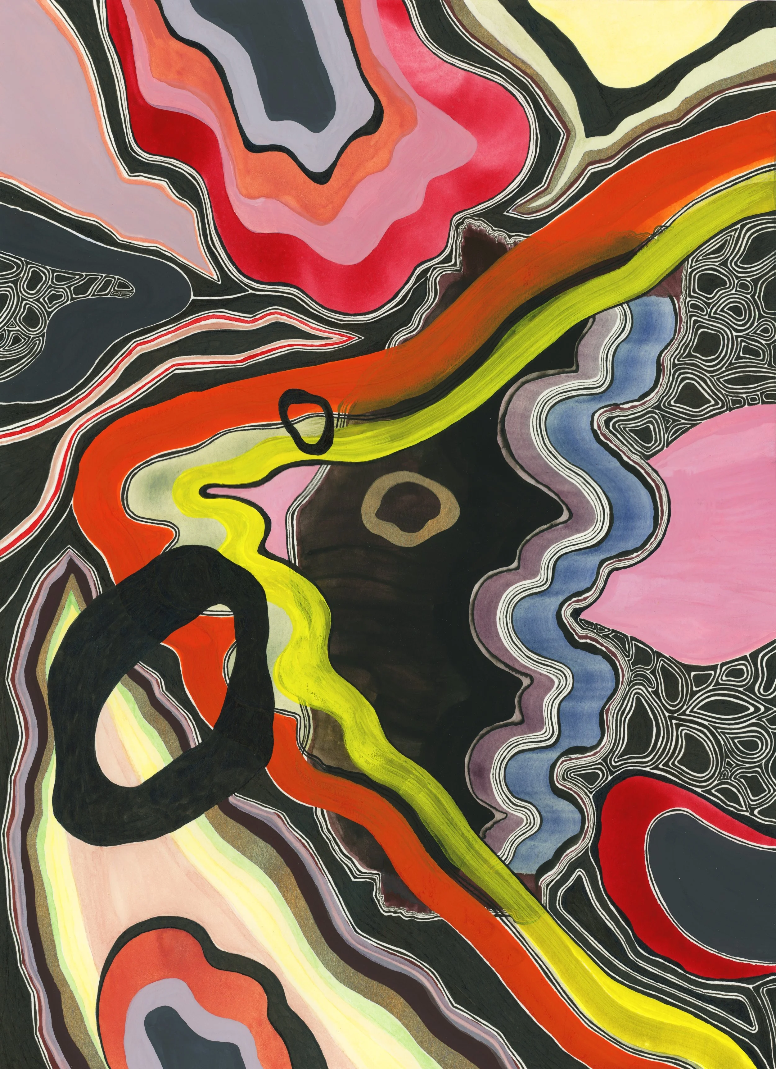 Elyse is a self-taught artist currently working in gouache, watercolor, watercolor pencil, colored pencil, and pen and ink, to create intuitively rendered ‘choreographies’ on paper